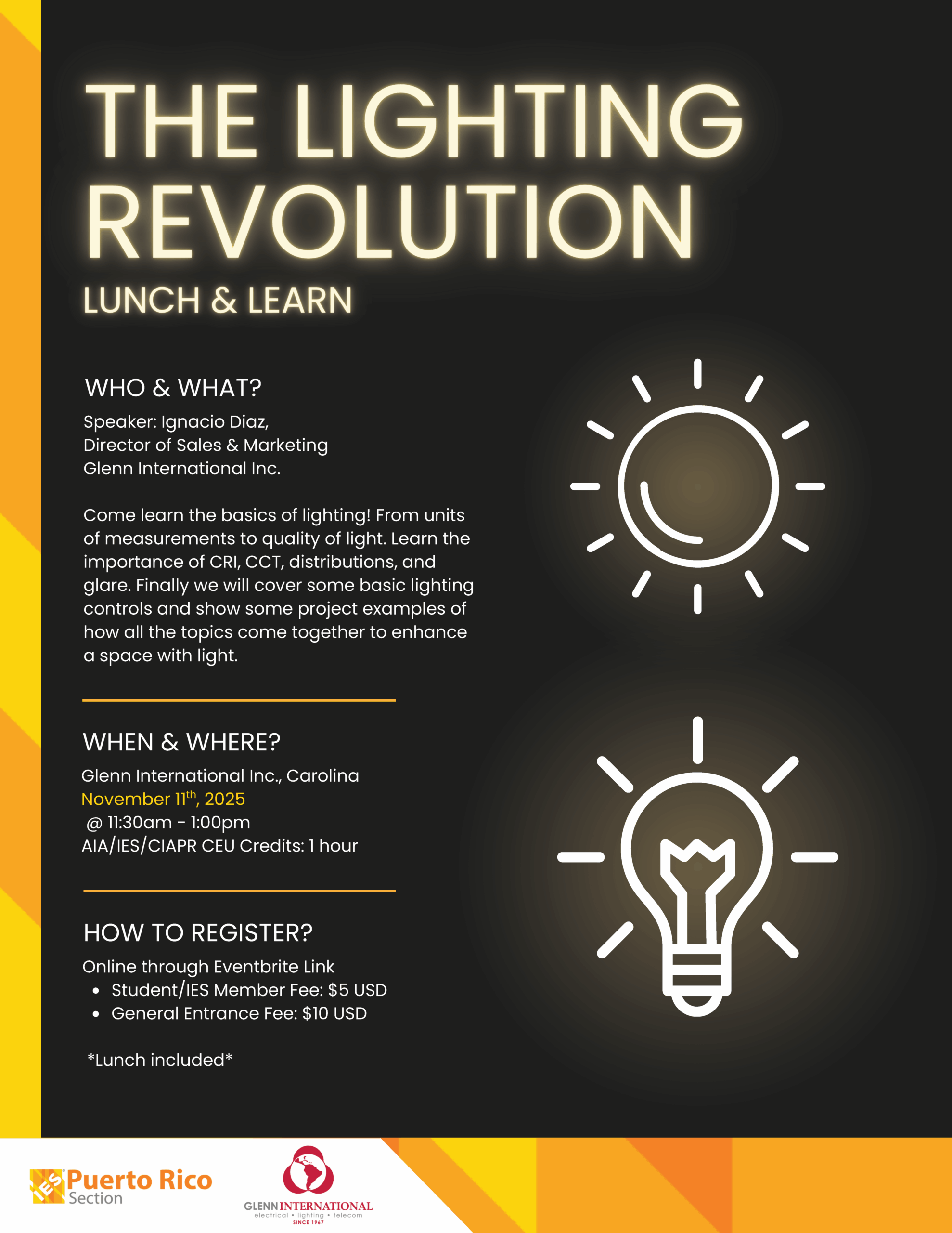 The Lighting Revolution + Add to Google Calendar + iCal / Outlook export 00 days 00 hours 00 minutes 00 seconds Tags: AIA, Arquitectos, IES PR, iluminacion Date Nov 11 2025 Time 11:30 am - 1:30 pm Category Trainings Share this event